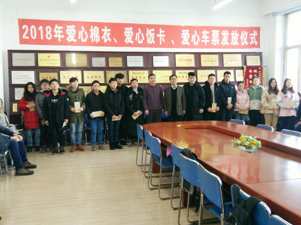 为进一步加强对【官网】家庭经济困难学生的资助力度,切实帮助贫困学生解决实际问题,丰富资助形式,促进扶育结合,12月28日,【官网】在主楼E0210学生处会议室举行2018年“爱心棉衣、爱心饭卡、爱心车票”发放仪式。学工部部长、学生处处长薛立刚,学工部副部长、学生处副处长曲长海,学生处相关工作人员及受助学生代表参加仪式,仪式由学生处大学生服务中心王鹏主持。