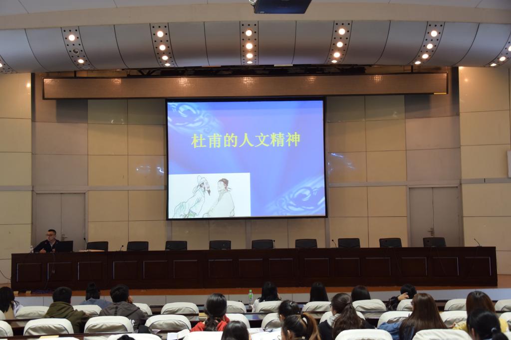 5月22日,人文社会科学学院徐猛老师在办公楼报告厅作《杜甫的人文精神》讲座。徐老师在讲座开始之前为大家推荐了校图书馆关于“杜甫”的优秀书目。他从自己在大学时代读杜甫诗歌的感受讲起,引起大学生听众的共鸣。在为广大学生解读时,他旁征博引、深入浅出,清晰阐释了杜甫如何在一生中矢志不渝地践行中华传统文化中“人”的精神,如何在一生中一以贯之地以“文”鉴证中华精神,如何在中国古代历史中成为当代大学生最为可学的“榜样”。讲座之后,很多同学再次通过各种方式重新去阅读杜甫的诗歌。