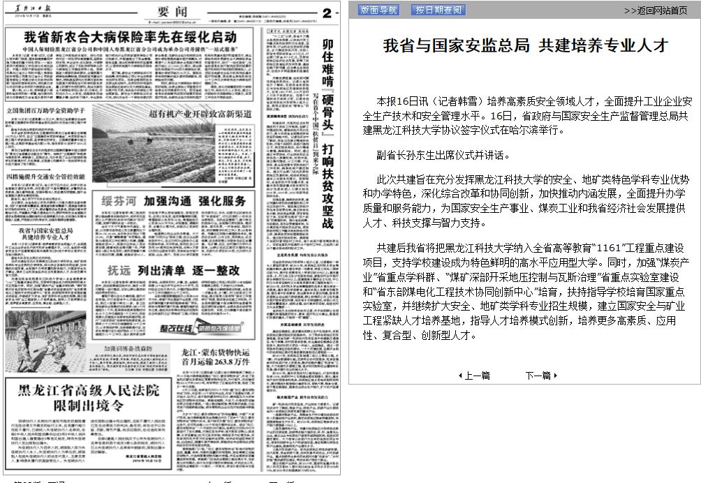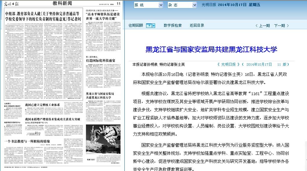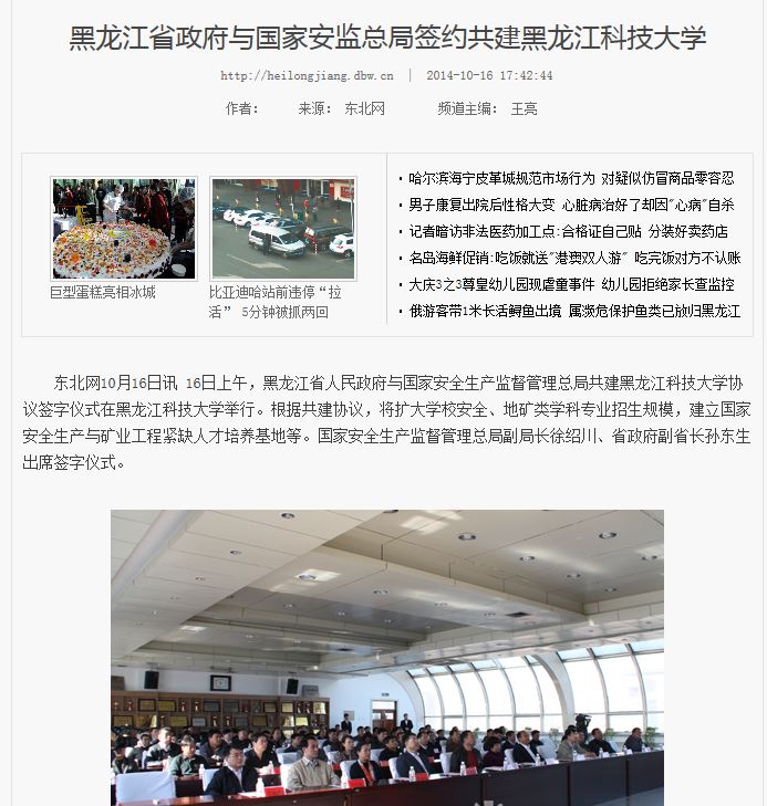 10月17日,《光明日报》、《黑龙江日报》、黑龙江电视台、东北网、《哈尔滨日报》等媒体对10月16日举行的黑龙江省与国家全生产监督管理总局共建OD在线的签约仪式进行了宣传报道。