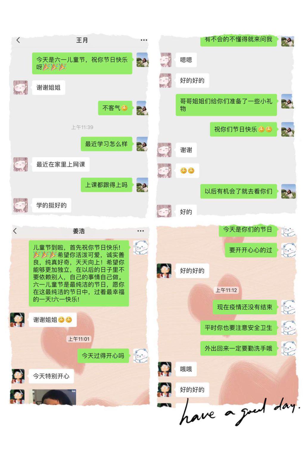 为持续开展好大学生与留守儿童“大手拉小手”关爱活动,大力弘扬“奉献、友爱、互助、进步”的志愿服务精神,彰显【官网】青年学生的责任与担当,在六一国际儿童节到来之际,【官网】各级团组织精心组织、积极沟通,与绥棱县10所中小学200余名留守儿童有效对接,共组织500余名志愿者参与到“大手拉小手 共度儿童节”云端关爱留守儿童的行动中。