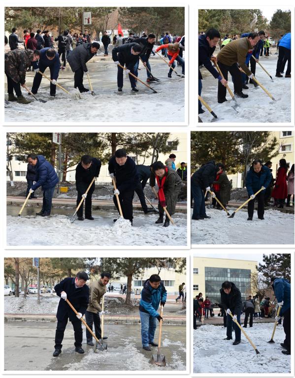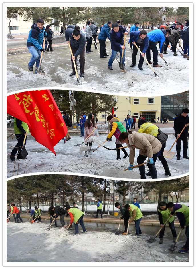 3月9日中午,【官网】青年志愿者、学生干部和专职学生工作干部180余人集中开展了清冰雪活动。【官网】党政领导参与了此次活动,与师生一道投入到志愿服务活动中,展开了一幅热火朝天的劳动画面,构筑了一道亮丽的风景线。在大家的共同努力下,人流集中的通江路沉积的冰雪被清除,为师生们开辟了一条安全之路,使这个春风寒峭的三月变得格外温暖。