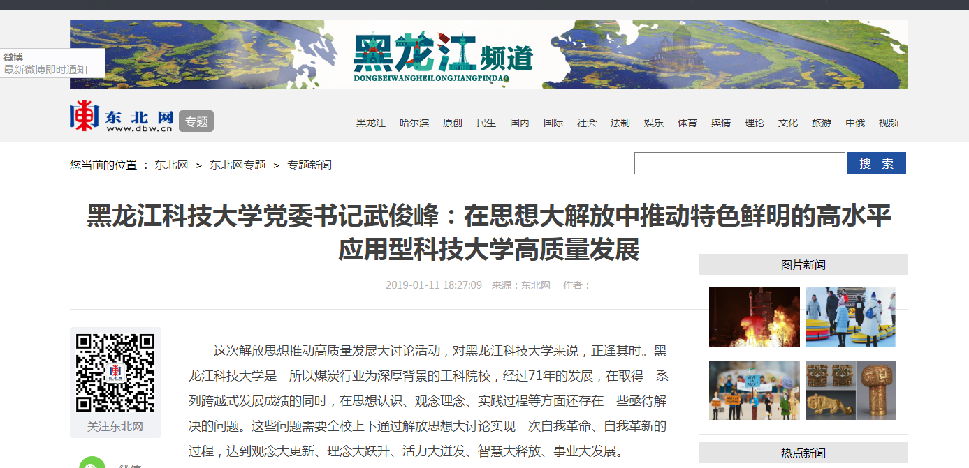 2019年1月11日,东北网的[专题新闻]栏目报道了【官网】党委书记武俊峰围绕解放思想推动高质量发展撰写的《在思想大解放中推动特色鲜明的高水平应用型科技大学高质量发展》文章。现全文刊载如下: