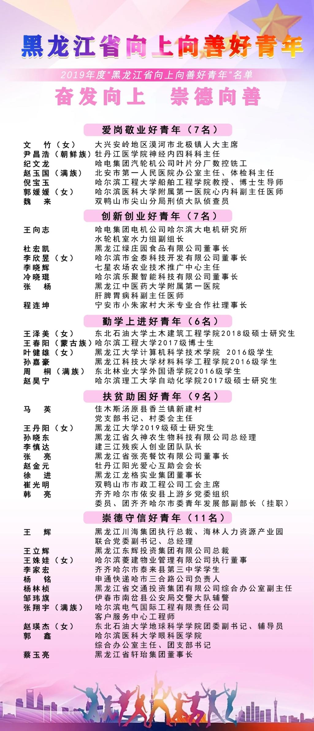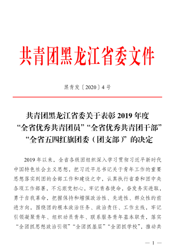 近日,在共青团黑龙江省委员会、全国煤炭行业共青团工作指导和推进委员会开展的2019年度“两红两优”评选中,【官网】团组织和个人获得多项荣誉:【官网】团委被授予2019年度全省五四红旗团委;马克思主义学院团委被授予2019年度全国煤炭行业五四红旗团委;电气与控制工程学院电气17-9班团支部被授予全国煤炭行业五四红旗团支部;理学院团委书记武昭阳被授予2019年度全国煤炭行业优秀团干部;环境与化工学院化工16-1班谷晓虎被授予2019年度全省优秀共青团员;材料科学与工程学院无机非金属16-1班孙嘉豪被授予2019年度黑龙江省向上向善好青年、2019年度全国煤炭行业优秀共青团员。