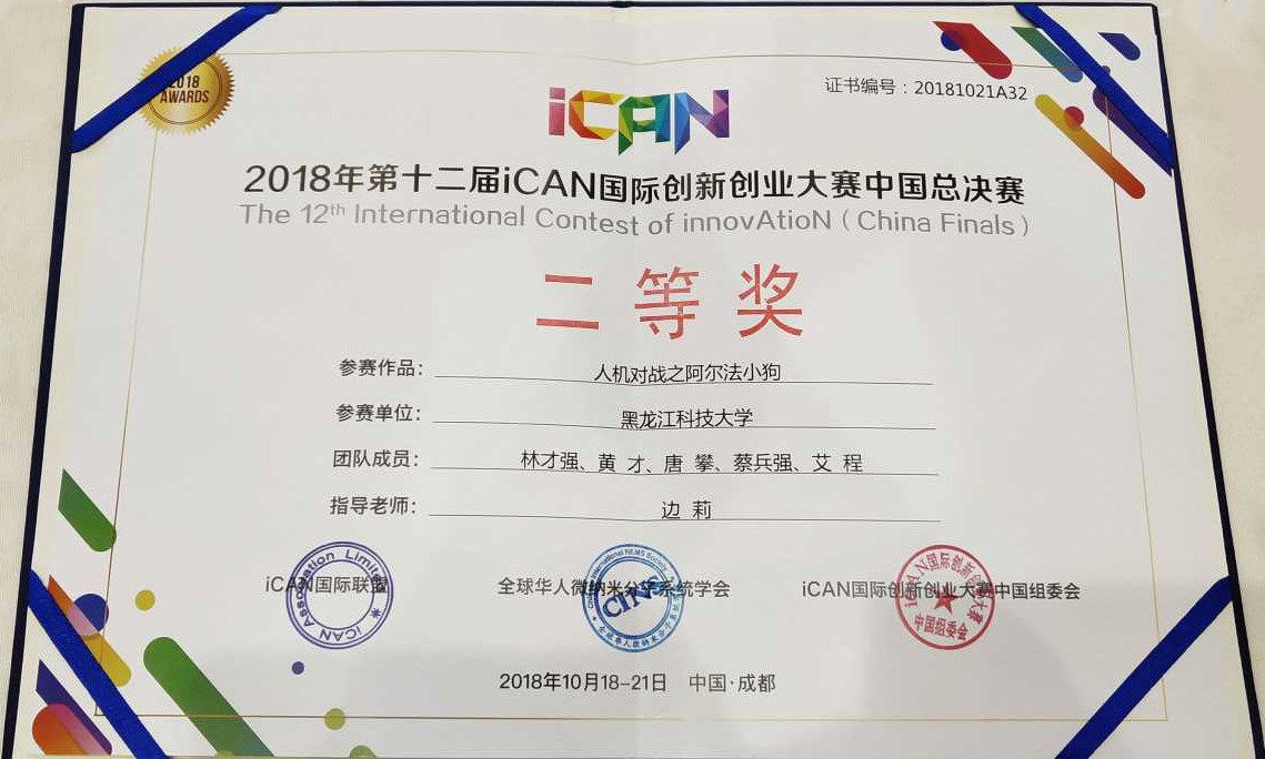经过激烈角逐,由【官网】边莉老师指导,电子与信息工程学院学生林才强、计算机工程学院学生黄才、蔡兵强、艾程,机械工程学院学生唐攀共同完成的作品《人机对战之阿尔法小狗》获得全国二等奖。