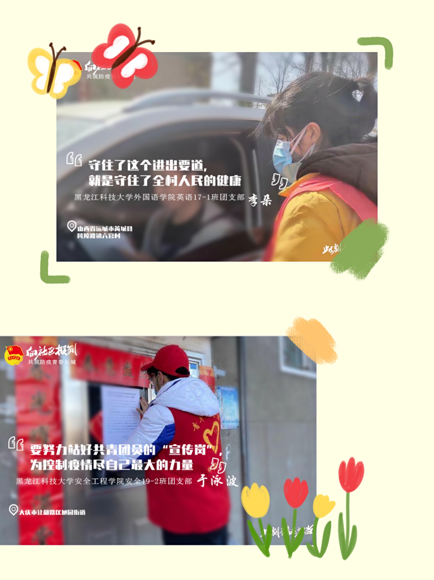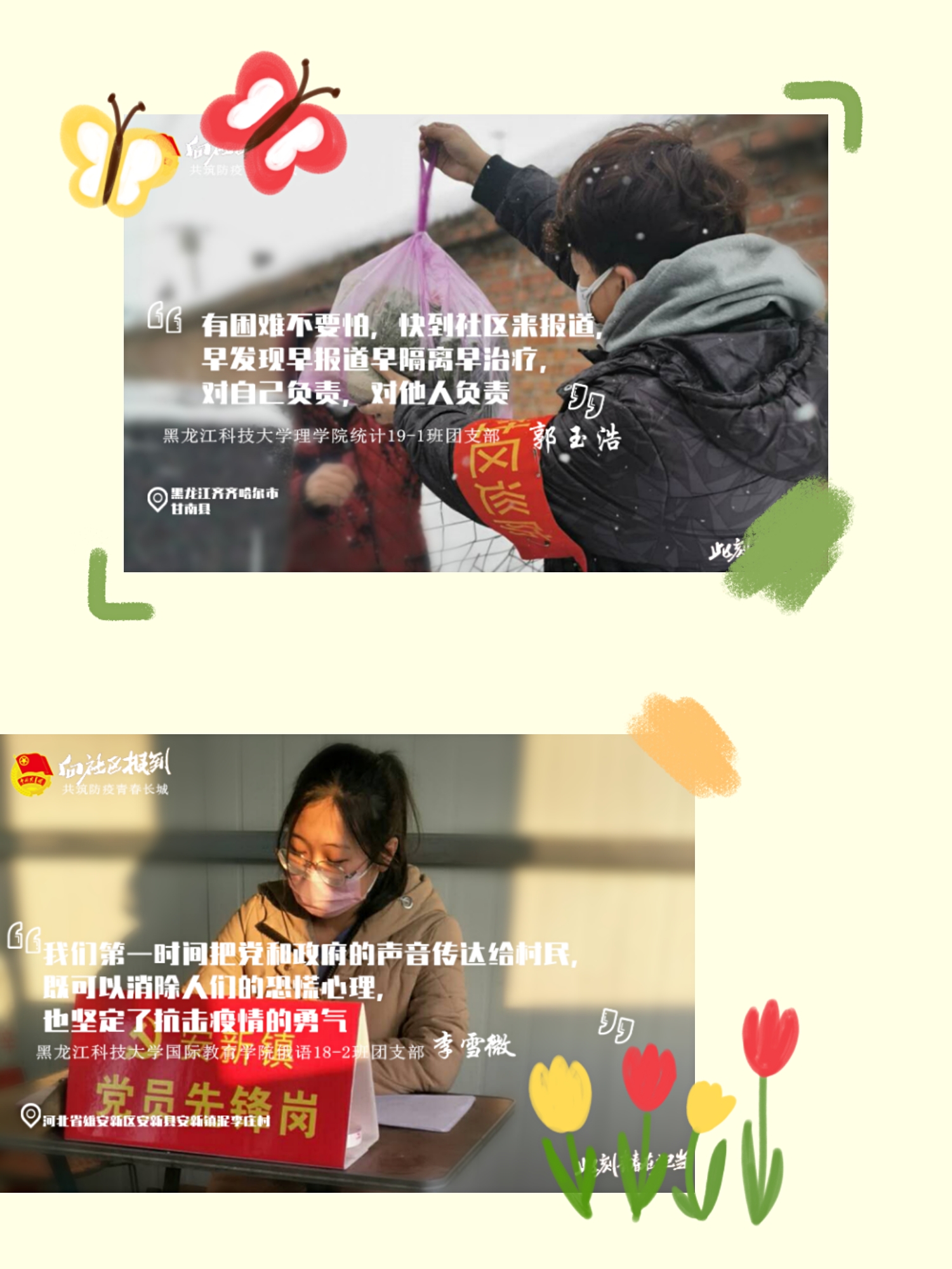 他们主动地向所在社区(村)报到,参与疫情防控工作。他们展现了95后、00后的责任和担当,在平凡的点滴中践行着习近平总书记所说的——成为“可爱、可信、可为的一代”。