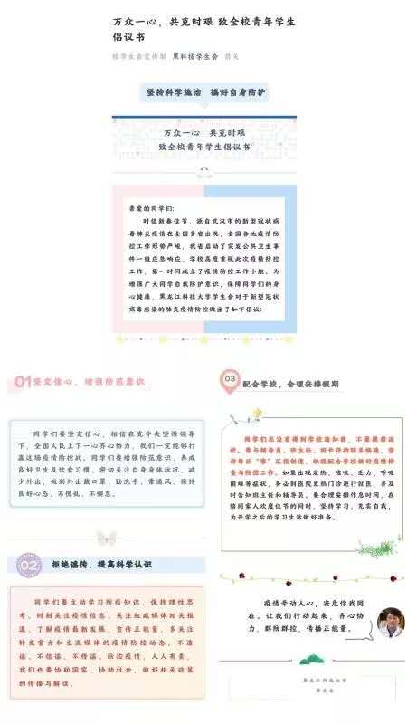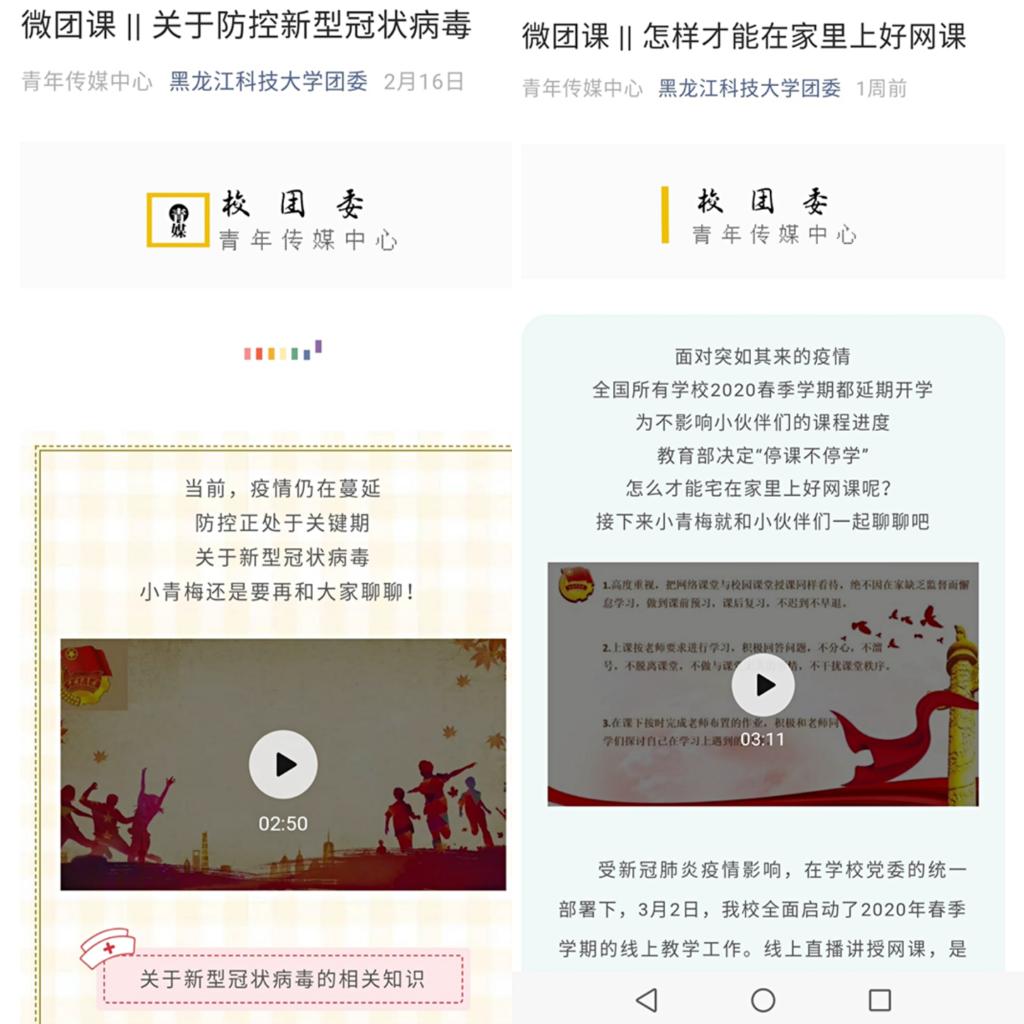 线上学习不掉线,多措并举助力学校“停课不停学”,用实际行动践行“厚德博学、强吾兴邦”的优良校训。校团委推出线上微团课《关于防控新型冠状病毒》《停课不停学--青年学生如何宅家上好网络教育课》特辑。