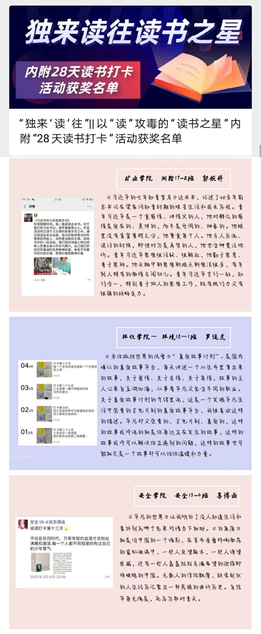 “独来读往”28天读书打卡活动,帮助广大同学做到“宅家不出行、学习也不停”。同学们选取喜爱的经典书单进行阅读,重温书中的美好,400余名同学坚持每天读书打卡,推选出15名读书之星,他们每天在朋友圈里分享精彩书评,一千个读者就有一千个哈姆雷特!