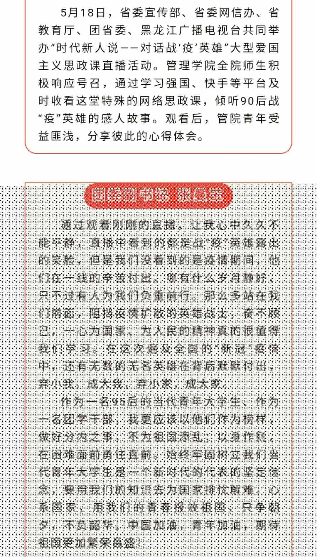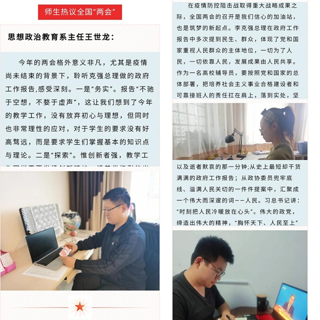 网络思政守初心。为加强青年学生思想引领和价值引领,校团委通过官方微信、网站持续推出8期“微团课”,结合工作实际和重要时间节点,充分发挥网络思想政治教育效能;管理学院举办“时代新人说——对话战‘疫’英雄”大型爱国主义思政课,通过学习强国、快手等平台及时收看这堂特殊的网络思政课,倾听90后战“疫”英雄的感人故事,同学们受益匪浅,分享彼此的心得体会;马克思学院开展“不忘思政初心——线上收看新闻联播”、“聚焦热点 关注两会”等活动,帮助同学们切实关注时事动态,通过组织统一收看新闻联播活动,提高思政学子的思想政治觉悟,深刻体会中国共产党的“能”、马克思主义的“行”和中国特色社会主义制度的“好”,激发OD在线学子的责任与担当。