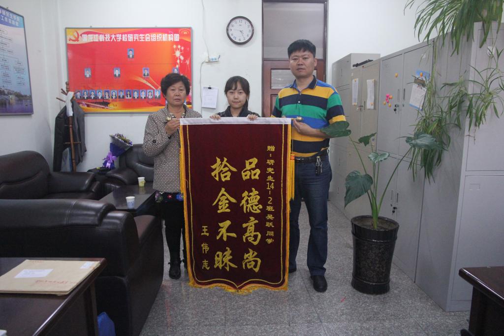 拾金不昧是中华民族的传统美德,是一个人高尚道德情操的体现,也是一名党员先进性的具体体现。9月18日下午,【官网】研究生学院收到了一面锦旗,这面锦旗是送给电气工程专业2014级硕士研究生吴跃同学的。
