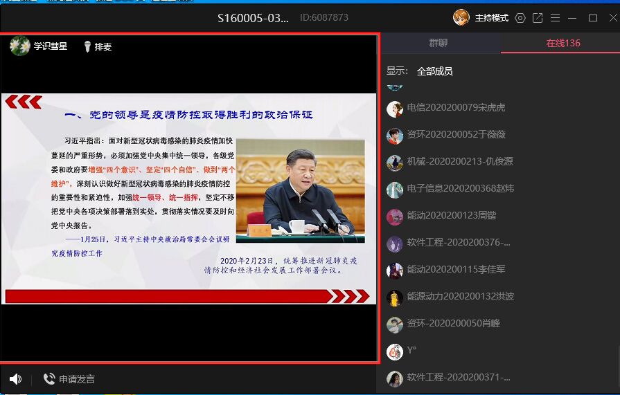 9月7日,【官网】2020学年秋季学期研究生线上教学正式启动。开课第一天全校开出网络课程13门,来自5个培养单位的研究生课程任课教师进行了网络授课。线上教学活动采用腾讯会议、QQ群课堂、微信、钉钉、智慧树、超星学习通等网络教学模式。学院领导深入课堂听课,三位研究生教育督学参与课前网络试课,课中做好听课记录,课后与老师反馈问题。各研究生培养单位主管领导及管理人员也进入本单位课堂了解课堂动态及授课情况。从首周的课程学习情况来看,在线教学有序开展,在网络直播课堂上,教师精神饱满,学生学习热情高涨,整个教学过程平稳有序,达到了预期的课堂效果。首周5个培养单位及2个授课单位共开出线上课程29门。