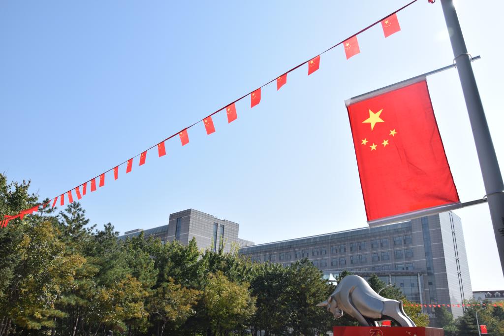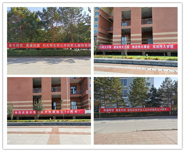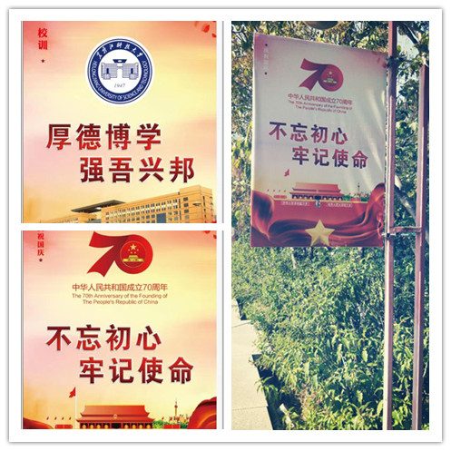 围绕庆祝新中国成立70周年,深入开展“不忘初心、牢记使命”主题教育,党委宣传部专门设计了“不忘初心、牢记使命”“厚德博学、强吾兴邦”宣传标语,悬挂在办公楼前和科技大厦楼前的路灯上,共同妆点着节日的校园。
