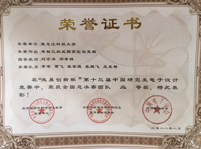8月18至21日,总决赛在南京工业大学举行,22日,颁奖典礼在南京工业大学礼堂举行。经过几个月的努力,我院邓老师指导研究生代表队在各赛区推荐的270余支总决赛队伍中崭露头角,其设计制作的“单相三级式隔离逆变器”,解决了使用能耗型负载测试电源时能量的浪费问题,得到评委专家的高度评价,并获得国家二等奖的好成绩,创造了【官网】研究生电子设计竞赛的新记录。