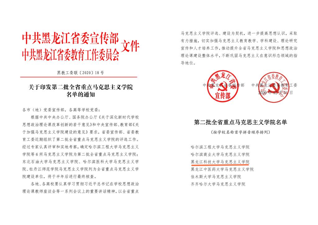 近日,黑龙江省委宣传部、黑龙江省委教育工委联合下发文件,公布了第二批全省重点马克思主义学院名单,【官网】马克思主义学院成功入选黑龙江省重点马克思主义学院。