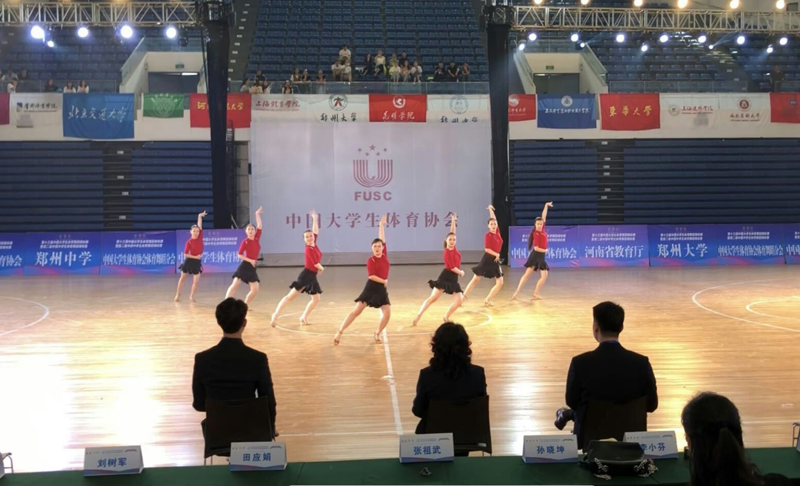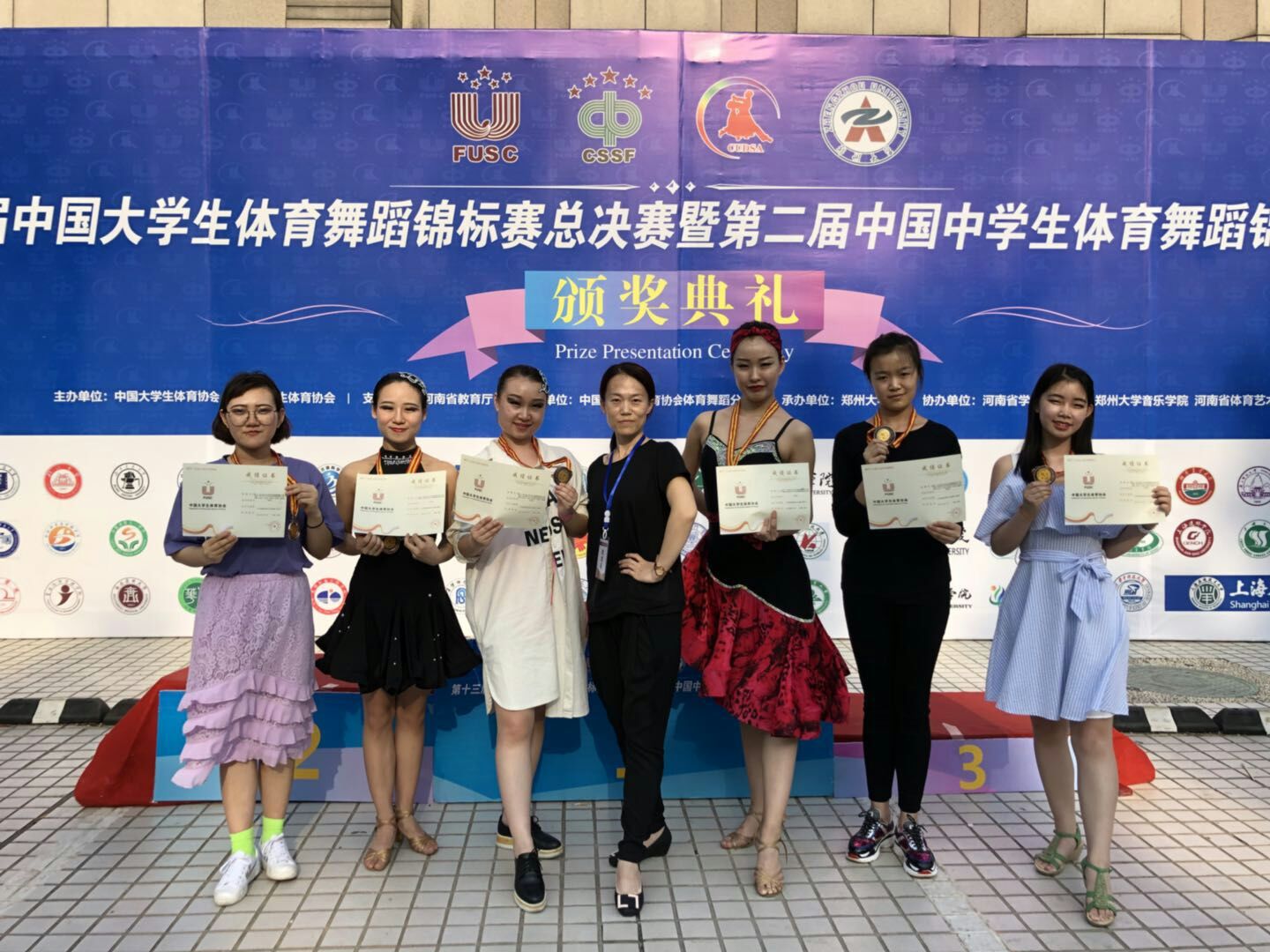 【官网】代表队由体育部刘聪老师担任教练,选派8名优秀运动员参赛。总决赛历时2天,参赛队员不畏强手、奋力拼搏,在4月28日的比赛中获得了“6人傣族华尔兹”的第三名和“艺术表演舞”的第四名。4月29日,在竞争激烈的女子单人两项(恰恰、伦巴)的比赛中,【官网】选手与北京交通大学、杭州电子科技大学、东北林业大学等11所高校的15名选手同台竞技,经过三轮的淘汰赛,最终【官网】管理学院信管16-1班的刘圣净和材料学院无机非16-1班的包琦萍同学分别获得了该项目第四名和第六名的好成绩。