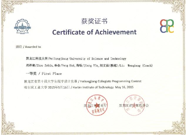 5月15日至5月16日,黑龙江省第十届大学生程序设计竞赛在哈尔滨工业大学举行。本届比赛由黑龙江省教育厅和黑龙江省计算机学会主办,哈尔滨工业大学承办,共有来自省内20所学校的130支队伍参加。【官网】由计算机学院刘文强老师带队,周泽彬、蒋银、奉会等学生参加了此次竞赛,经过激烈角逐,最终【官网】参赛队获得一等奖1项、三等奖1项的优异成绩。