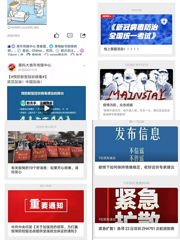 加强防疫宣传,强化舆论引导。各级团组织科学把握疫情防控舆论引导工作的时度效,及时面向青年学生发布权威信息、准确解读防控措施、有效疏导恐慌情绪、主动传播健康卫生知识、坚决遏制谣言扩散,激发出、凝聚起打赢防控阻击战的强大精神力量。自1月23日起,陆续通过校园网、官方微博、微信、QQ空间等官方平台密集推送宣传疫情防护知识、最新疫情消息、学校疫情防疫公告等20余篇,总阅读量2万余人次。