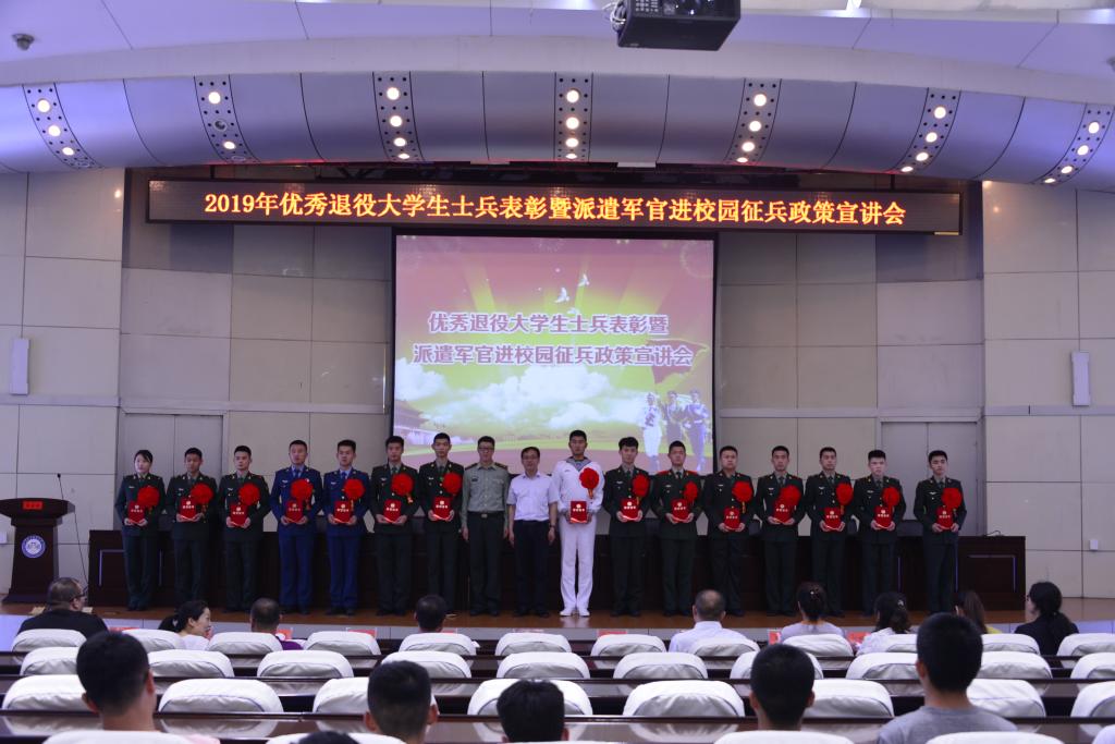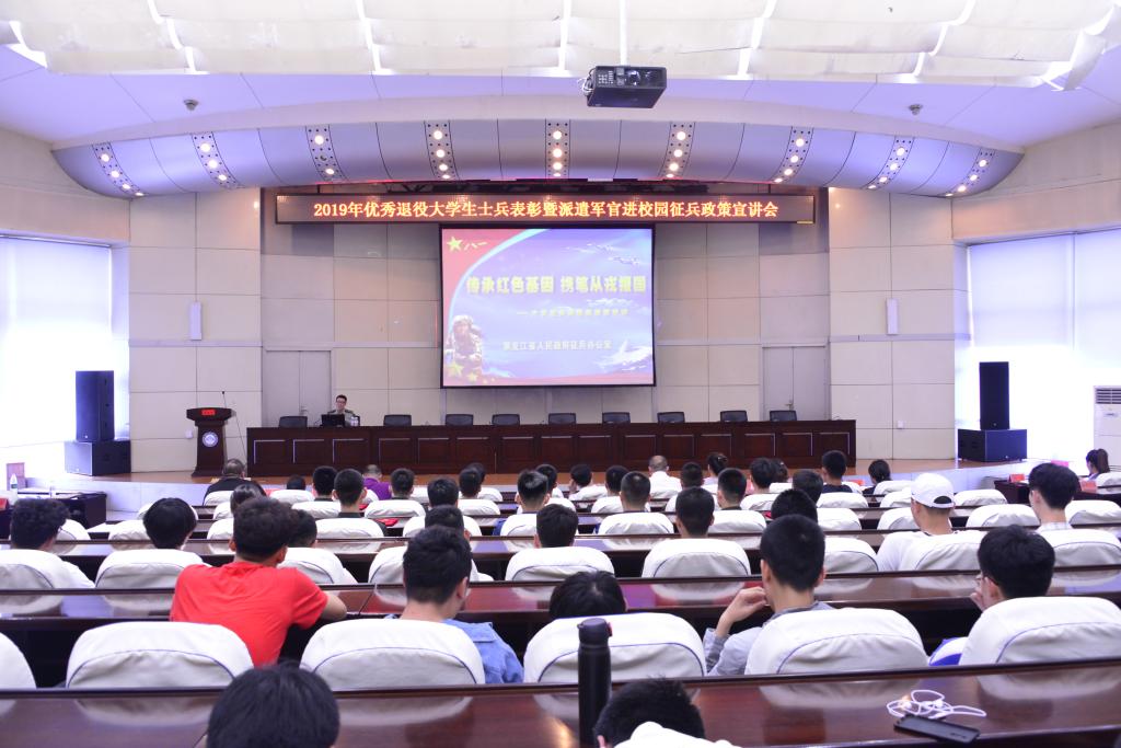 6月5日下午,【官网】2019年优秀退役大学生士兵表彰暨派遣军官进校园征兵政策宣讲会在报告厅举行。黑龙江省大学生征兵宣讲团成员、省军区学军事教研室主任王欣研中校受邀出席宣讲会,学校各学院负责征兵工作的辅导员、优秀退役大学生士兵和有参军意愿的学生代表300余人参加了宣讲会。