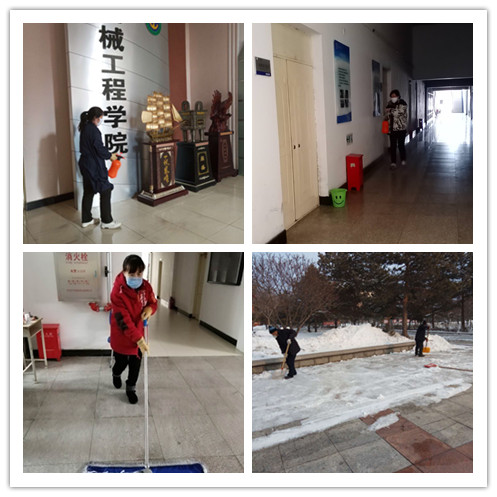 后勤管理处贯彻落实校园防疫工作措施,组织有关人员对值班区域,提前进行卫生清扫和防疫消杀工作,并对校园路上的冰雪进行清理。