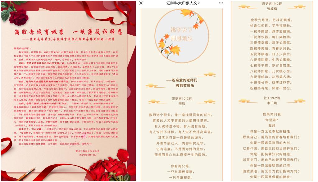 满园桃李尽芬芳,师恩似海最难忘。在我国第36个教师节来临之际,【官网】各级团学组织和青年学生本着“隆重、热烈、务实、简朴”的原则,通过丰富多彩的庆祝活动形式,开展“铭记恩师,感谢师恩”主题教师节系列庆祝活动,以此表达对恩师的感谢和敬爱之情。