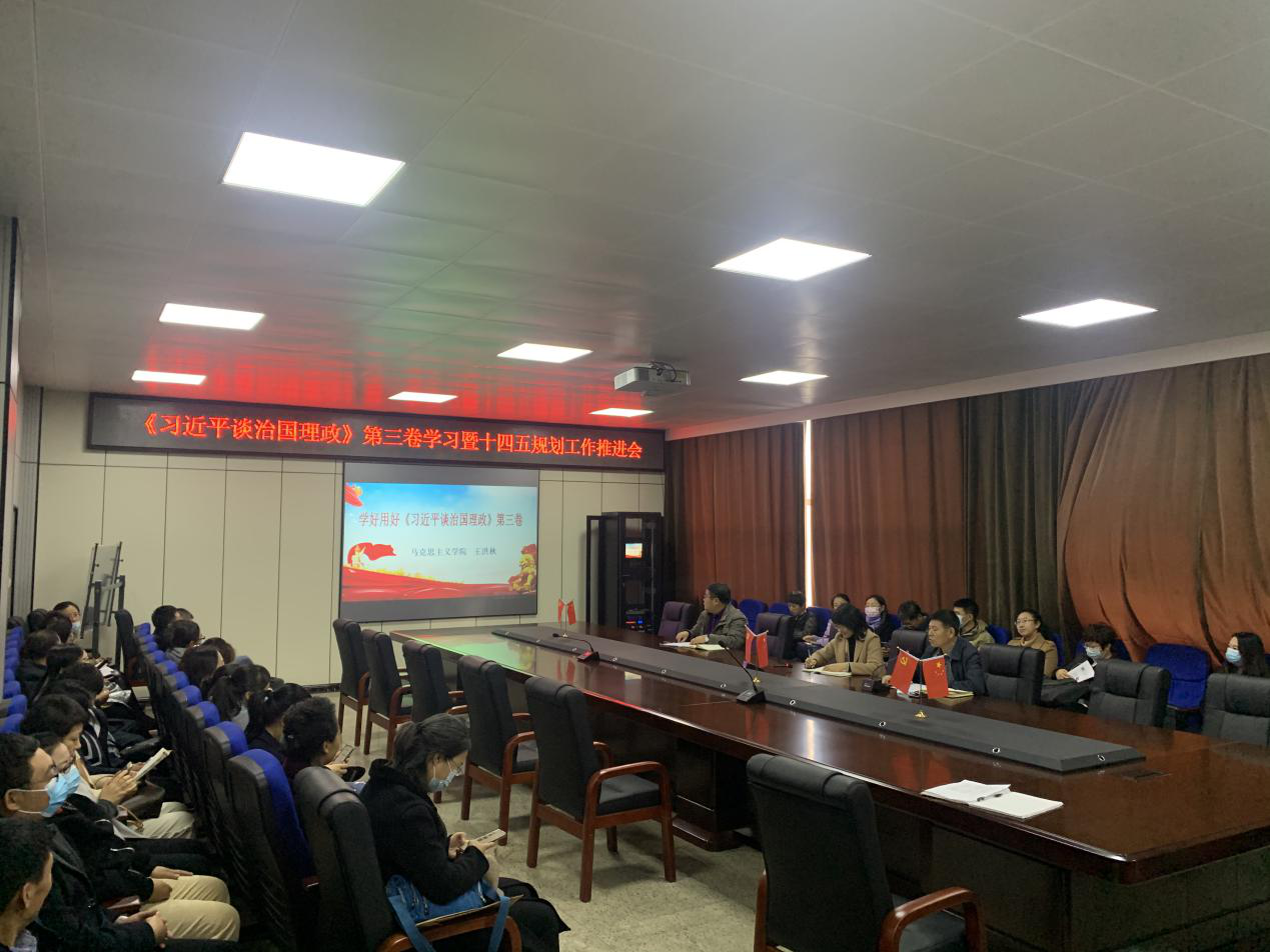 10月28日中午,马克思主义学院在科技大厦二楼会议室召开《习近平谈治国理政》第三卷学习会。宣讲团成员、院长王洪秋以“学好用好《习近平谈治国理政》第三卷”为主题,为全院教师作了专题辅导。会议由学院党总支书记张影主持。
