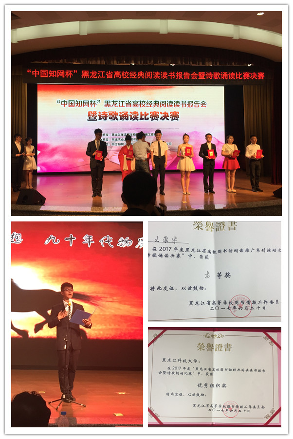由黑龙江省高等学校图书情报工作委员会主办的“中国知网杯”黑龙江省高校经典阅读读书报告会暨诗歌诵读比赛决赛,于6月20日在东北农业大学图书馆一楼报告厅举行。来自黑龙江省22所高校选送的71个作品参赛。经过初赛、复赛的角逐,最终有22个作品入围决赛。由【官网】图书馆选送的参赛选手王崇宇同学发挥出色,以得分排名第六的好成绩获得大赛三等奖。钟敬文、古秋云、朱佳欣三位参赛选手分别荣获诗歌诵读比赛优秀奖和经典阅读演讲比赛优秀奖,图书馆荣获大赛优秀组织奖。