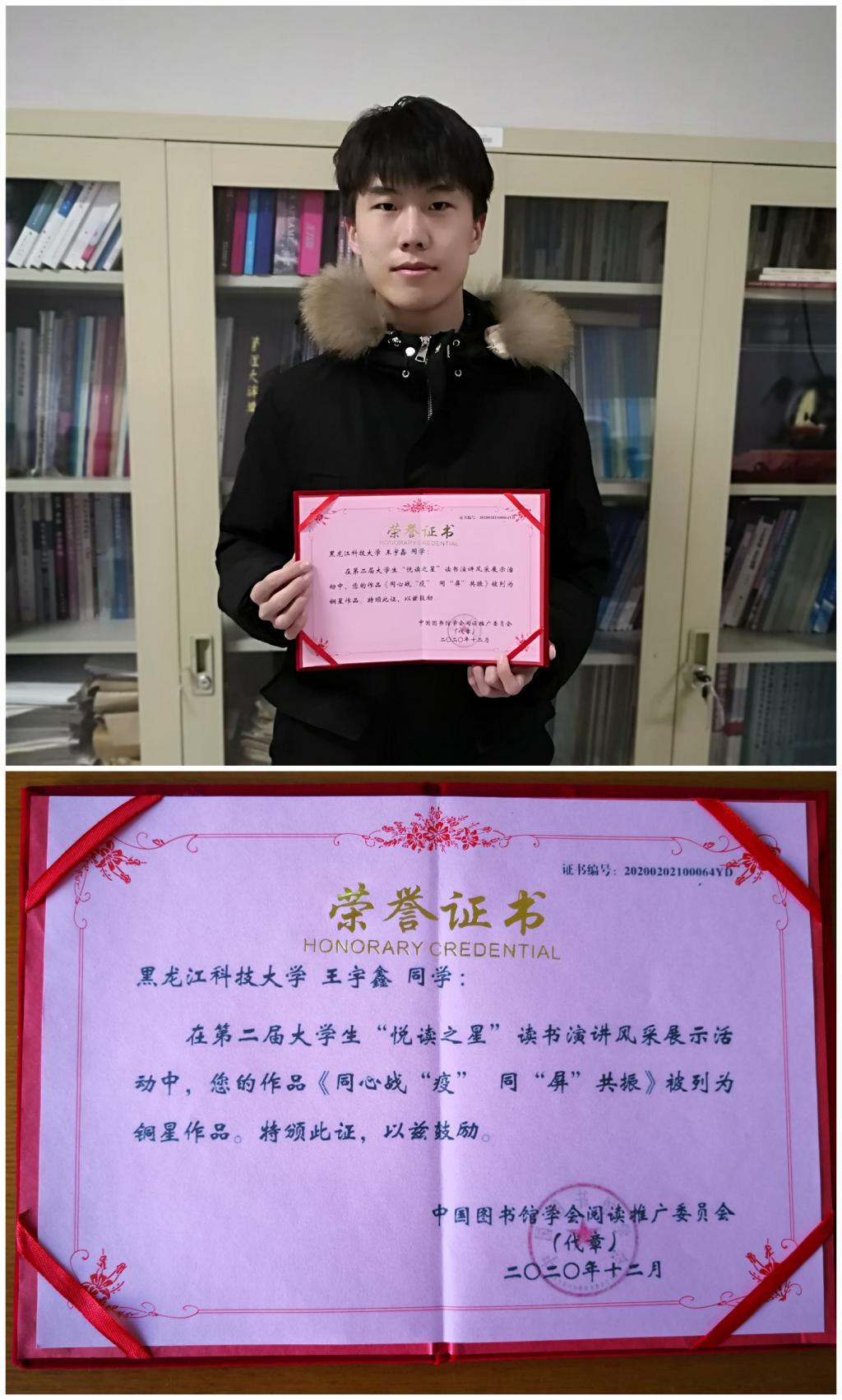 由中国图书馆学会阅读推广委员会主办,青岛科技大学图书馆、武汉大学图书馆承办的第二届大学生“悦读之星”读书演讲风采展示活动近日颁奖,【官网】管理学院王宇鑫同学的作品《同心战“疫” 同“屏”共振》获“铜星作品奖”。