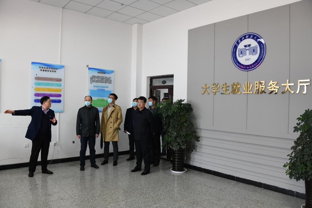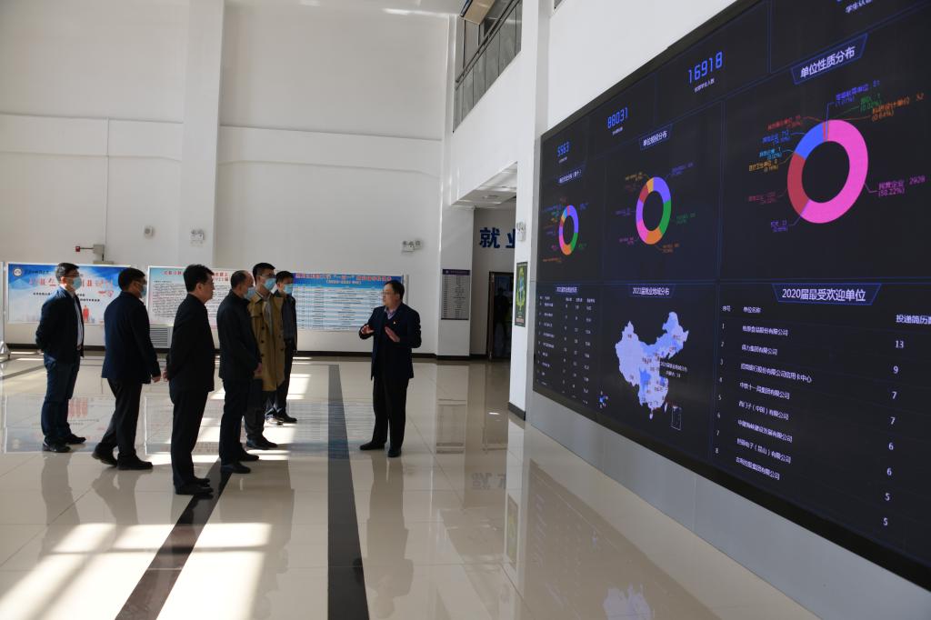 调研指导组一行还查看了开展党史学习教育的相关材料,并通过走流程的方式到就业服务大厅、学生处心理咨询室、国际教育学院心理咨询室、学生服务大厅等处开展工作调研。