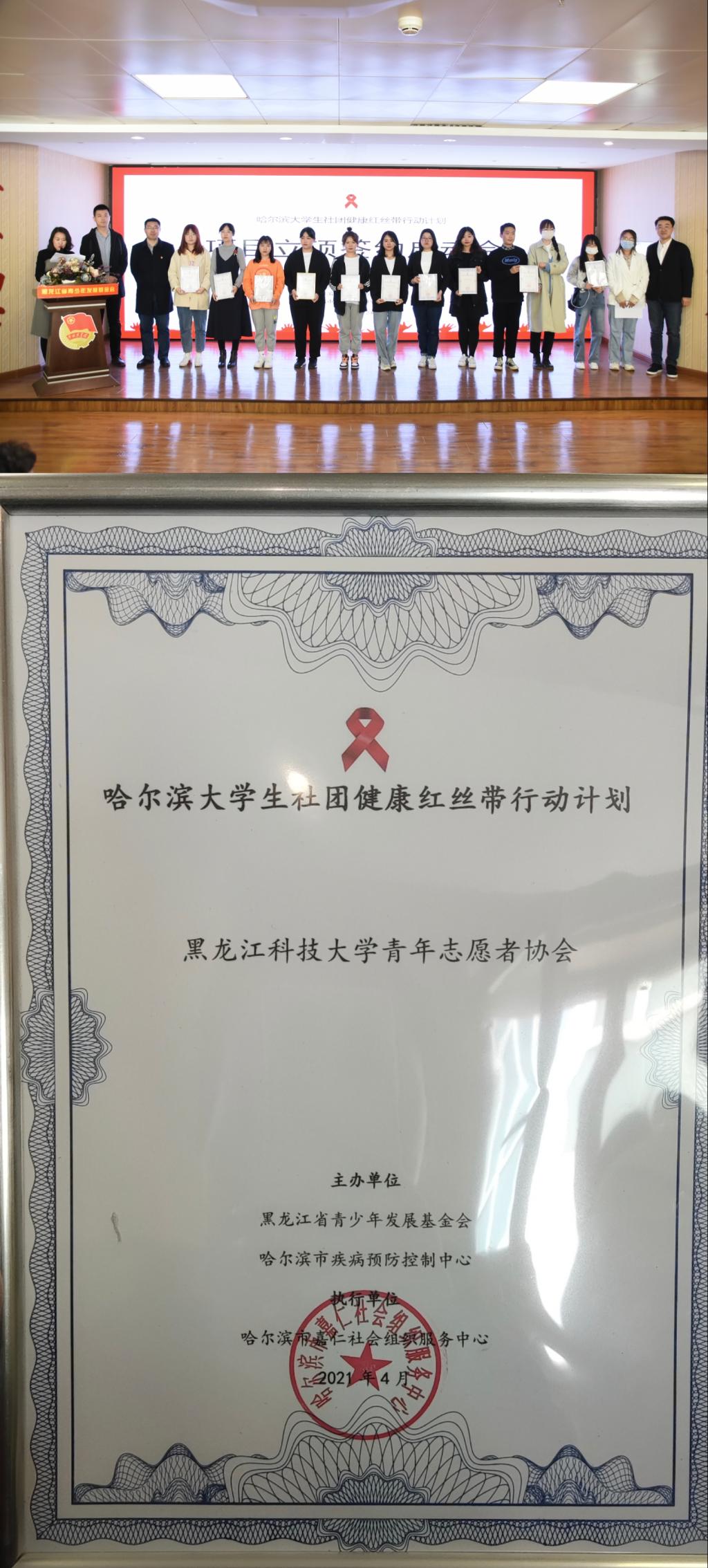 4月24日,哈尔滨大学生社团健康红丝带行动计划项目立项签约启动会在黑龙江省青少年发展基金会举行,【官网】青年志愿者协会作为首批60个项目入选,并签订了《项目资助协议》,获批项目经费4000元。哈尔滨大学生社团健康红丝带行动计划,由黑龙江省青少年发展基金会和哈尔滨市疾病预防控制中心主办,多年来切实发挥各高校学生社团育人功能,推广和普及防艾抗艾知识,不断巩固防艾成果,建设健康校园。
