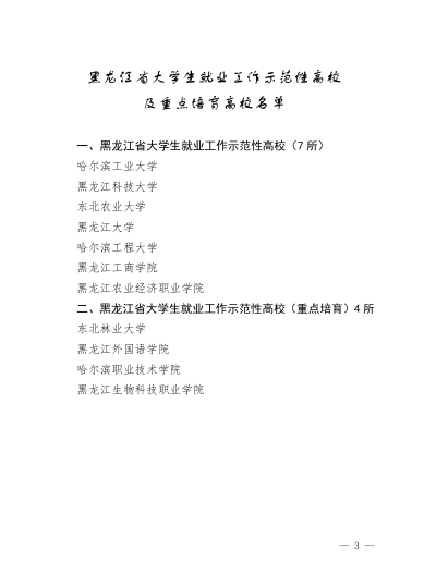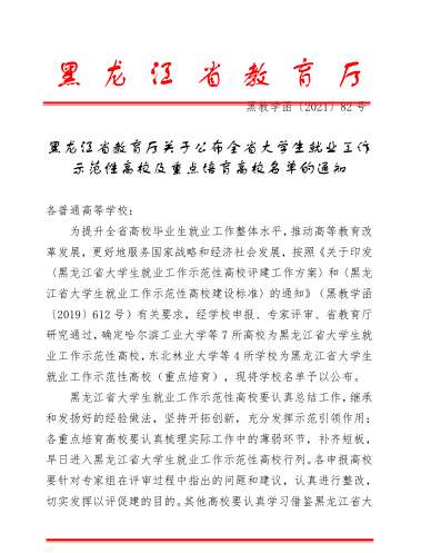近日,省教育厅下发了《关于公布全省大学生就业工作示范性高校及重点培育高校名单的通知》,【官网】被确定为“黑龙江省大学生就业工作示范性高校”,成为全省7所首批获此荣誉称号的高校,也是全省唯一一所获此殊荣的公办应用型本科高校。