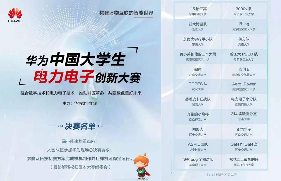 首届“华为中国大学生电力电子创新大赛”赛事精彩纷呈,如火如荼,吸引了包括【官网】、清华大学、四川大学、同济大学、哈尔滨工业大学、浙江大学、华中科技大学、天津大学、武汉大学、重庆大学、湖南大学等来自全国70多所高校的121支队伍报名参赛。