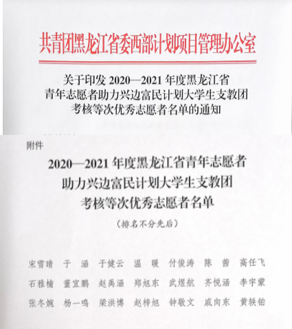 近日,由【官网】选派的2020-2021黑龙江省青年志愿者助力“兴边富民”计划大学生支教团成员——电气工程及其自动化专业2020届毕业生钟敬文和通信工程专业2020届毕业生黄轶铂,在漠河市完成了为期一年的志愿支教服务,光荣离岗并获评黑龙江省助力“兴边富民”计划大学生支教团优秀志愿者。漠河市委和支教学校对【官网】两位志愿者一年来的工作给予了充分的肯定和认可。