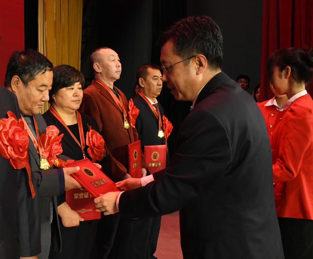 校党委书记周宏力,校长郝传波为获得“执教三十年纪念奖”教师们颁发奖牌和证书。