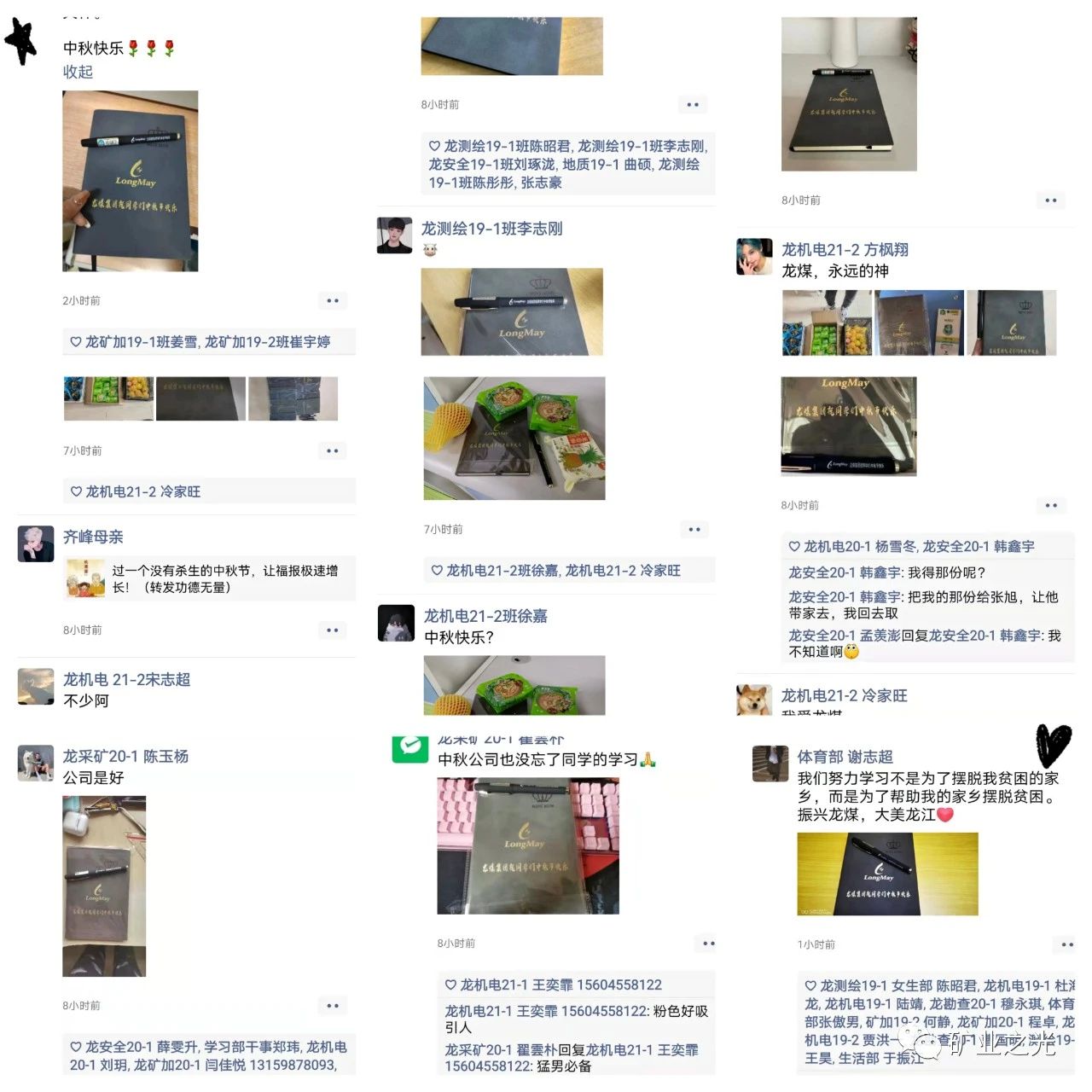 龙煤学院龙矿加19-1班 全体学生:皎月又满,家人相聚,又是一年团圆时。虽因疫情暂居学校,无法与家人相见,但龙煤集团却将温暖送进了每一位同学的心。在中秋来临之际,集团为我们每一位同学送来了所必需的文具用品,并在上面附上对大家的祝福。团圆节,相思情,感谢龙煤集团对我们的关心和温暖,礼物包住了温暖,缓解了入秋的寒,文具承接了温情,绘出了中秋的圆。不是亲人,却比亲人还暖,我们身为龙煤人,感到无比的自豪,在中秋节之际,祝愿龙煤集团越来越好,辉煌永久!