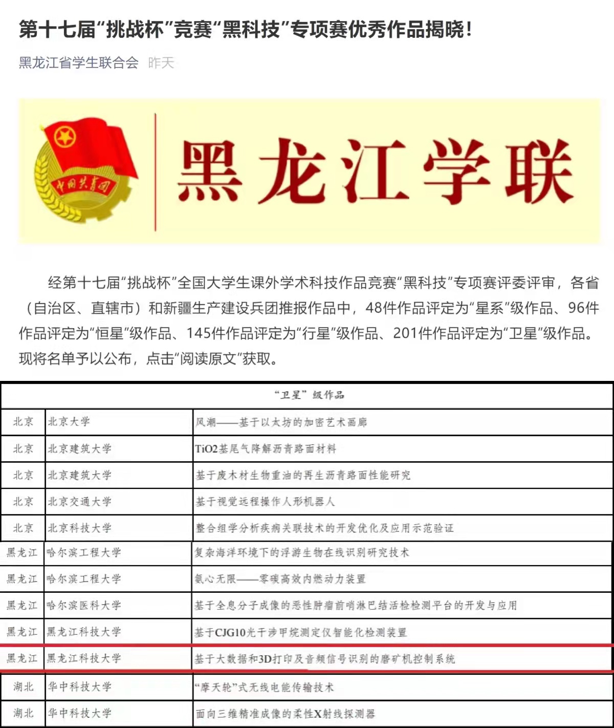 第十七届“挑战杯”全国大学生课外学术科技作品竞赛“黑科技”专项赛优秀作品于近日揭晓,由电子与信息工程学院推荐,杨庆江、孙曼老师指导的《基于CJG10光干涉甲烷测定仪智能化检测装置》和矿业工程学院推荐,杨晓峰、康华、吕玉庭老师指导的《基于大数据和3D打印及音频信号识别的磨矿机控制系统》2个项目被竞赛组委会评为“卫星”级作品。在本届“挑战杯”竞赛“黑科技”专项赛国赛中黑龙江省共有【官网】和哈尔滨工程大学、哈尔滨医OD在线学三所高校在此专项赛中获奖。