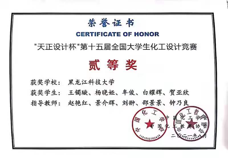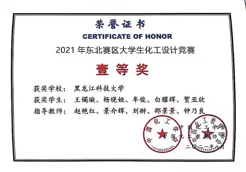 此次比赛得到学校教务处、环化学院的高度重视,为全面落实【官网】“立足应用、精准育人”的教学理念,促进学生化学工程设计实践能力的提高。2021年3月,学校教务处、环化学院面向学校大学生启动了第八届“环化杯”大学生化工设计竞赛,共有18支代表队参赛,评选出“炉火醇青”“微观视界”“黑科技突击队”“青春螺旋队”“一梦江湖广寒秋”5支优秀队伍。在赵艳红、景介辉、钟乃良、邵景景等指导教师指导下,历经三个多月,精心设计参赛作品,最终“炉火醇青”代表队以优异的成绩被选入参加东北赛区决赛和全国总决赛。