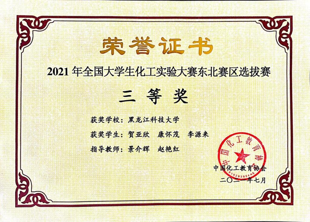 近日,【官网】景介辉、赵艳红两位老师共同指导的化工专业2018级王镯璇、蚁克楠、牟俊同学组成的团队在2021年第四届全国“互联网+化学反应工程”课模设计大赛中喜获一等奖。这支队伍是在黑龙江省普通高等学校创新创业教育指导委员会举办、哈尔滨工业大学承办的黑龙江省大学生化工实验赛中脱颖而出的,【官网】另一团队化工专业2018级贺亚欣、康怀茂、李源来获东北赛三等奖。同时,【官网】刘云夫、董子龙两位指导教师指导的由化工专业2018级薛媛萌、康怀茂、彭吉源和曹纪安四名同学组成的“龙飞队”在2021年第四届全国“互联网+化学反应工程”课模设计大赛上荣获大赛三等奖,此次大赛有来自全国的183所院校参加,【官网】参赛作品经过了作品初审、修改、终审等多个环节最终荣获三等奖的好成绩。