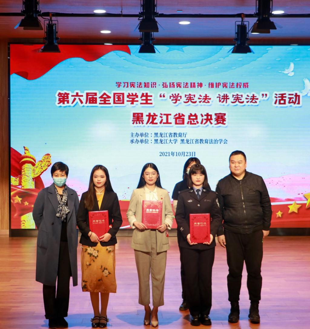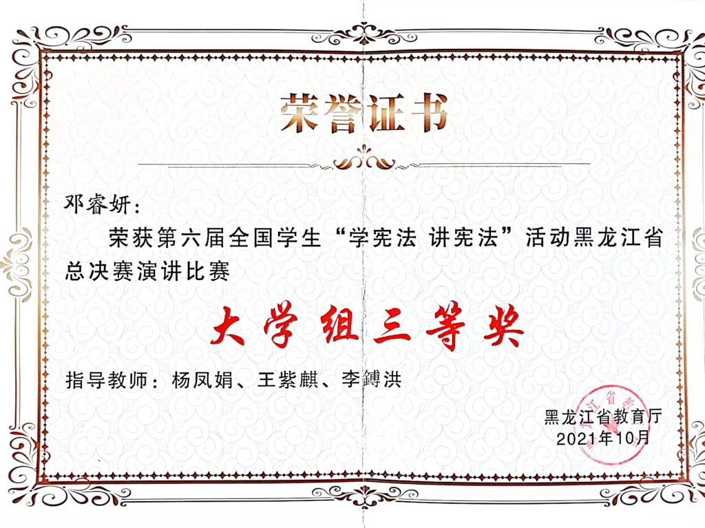 近日,由黑龙江省教育厅主办,黑龙江大学和黑龙江省教育法治学会承办的2021年第六届全国学生“学宪法,讲宪法”活动黑龙江省总决赛顺利完赛。由【官网】教师杨凤娟、王紫麒、李鎛洪共同指导的人文社会科学学院学生邓睿妍在比赛中取得了黑龙江省总决赛演讲比赛大学组三等奖的佳绩。