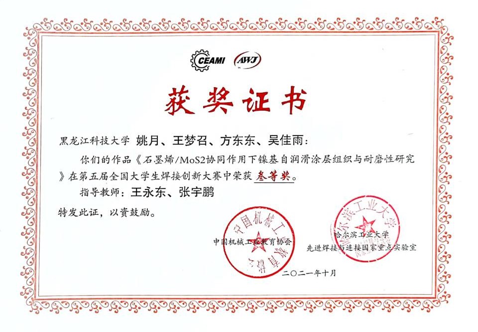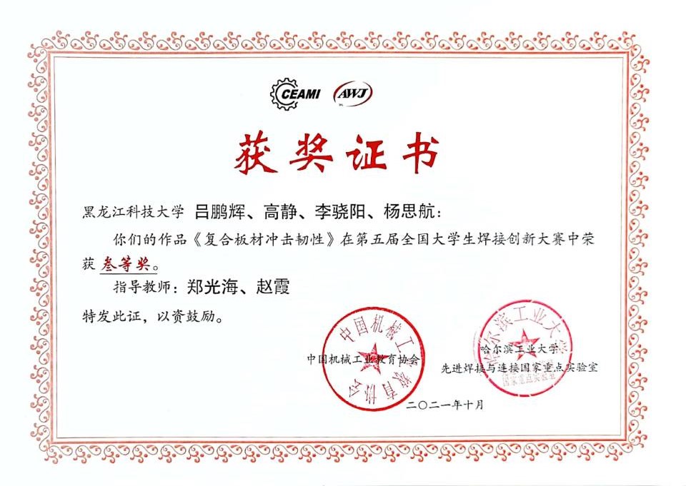 近日,第五届全国大学生焊接创新大赛在哈尔滨举行,本届大赛由中国机械工业教育协会和哈尔滨工业大学先进焊接与连接国家重点实验室主办。有来自清华大学、哈尔滨工业大学、天津大学等49所高校的148件作品入围决赛。在学校教务处、材料学院的高度重视和大力支持下,【官网】代表队获得二等奖1项,三等奖3项的好成绩。