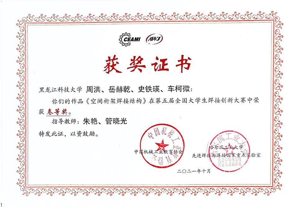 此次大赛按固定命题项目和自由选题项目两大类分别进行。【官网】焊接技术与工程专业教学团队从题目选择、材料准备、工艺和结构设计、创新应用等每个环节,师生共同研讨,反复试验。最终由朱艳老师带队,焊接专业本科生组成的4支队伍进入大赛决赛。经大赛初审,现场测试和答辩等环节,栾亦琳和杨翟平老师指导本科生陈梓琳、杨亿波、资康明、谭鹏飞的作品《异种材料扩散焊缺陷超声检测和缺陷智能识别研究》获得自由选题组二等奖,其它3件作品获得三等奖。