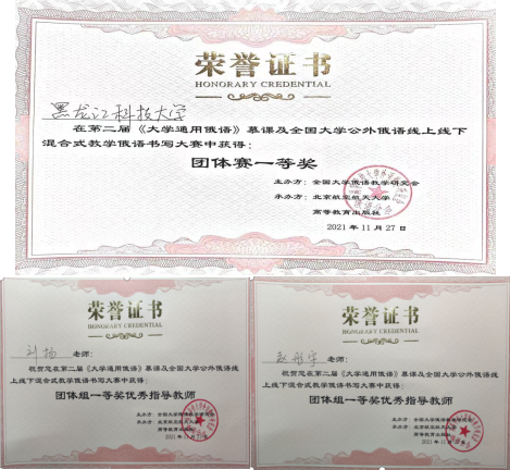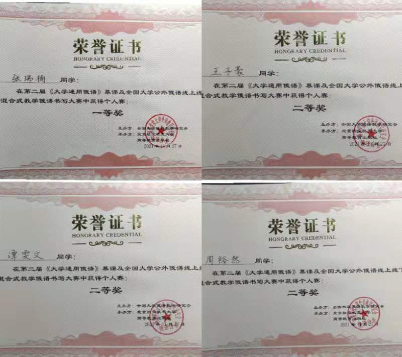 近日,由全国大学俄语教学研究会、北京航空航天大学、清华大学语言中心、高等教育出版社联合举办的第二届全国大学俄语书写大赛圆满落幕。在本届大赛中,【官网】荣获团体赛一等奖,共有15名同学获得个人赛奖项,其中一等奖1项,二等奖4项、三等奖5项、优秀奖5项,【官网】教师刘扬、赵彤宇荣获”优秀指导教师“称号。