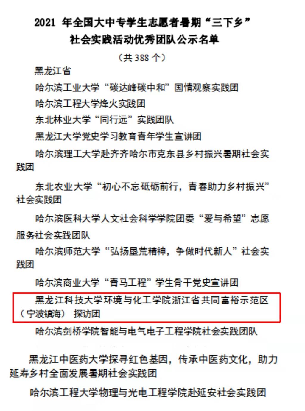 近日,团中央对2021年全国暑期“三下乡”社会实践活动中表现突出的单位、集体和个人进行了总结表彰。【官网】团委被评为“优秀单位”,环化学院团委组建的浙江省共同富裕示范区(宁波镇海)探访团被评为“优秀团队”,获得了近年来【官网】社会实践工作最好成绩。