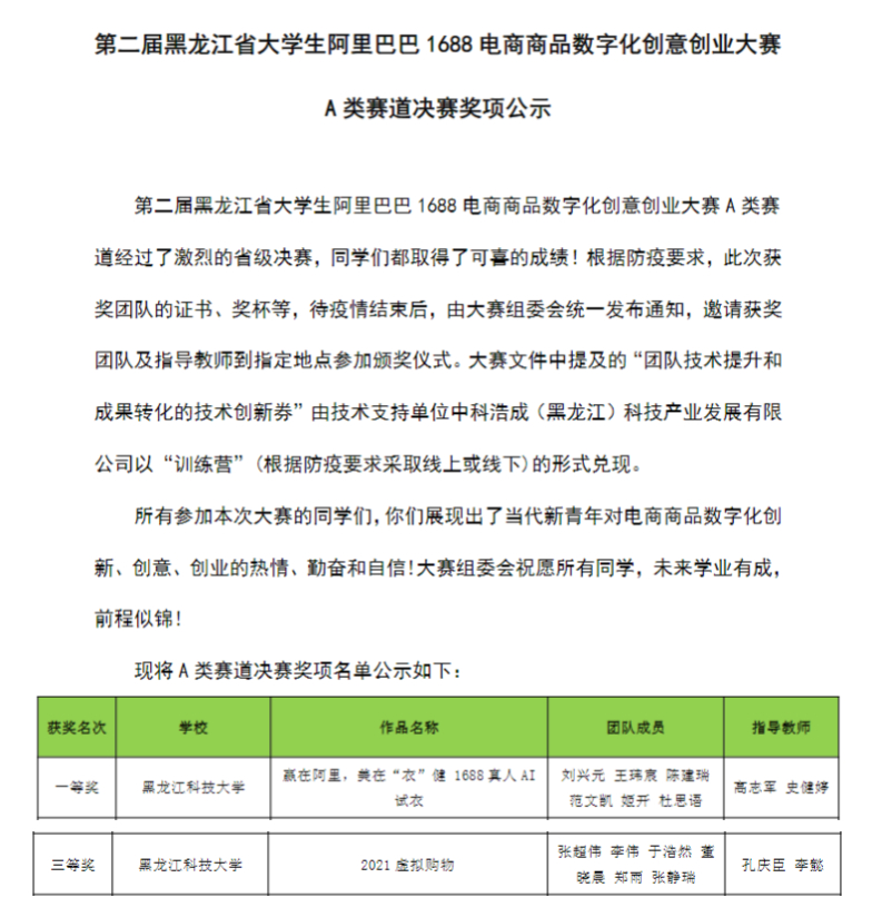 近日,第二届黑龙江省大学生阿里巴巴1688电商商品数字化创意创业大赛在线上举行。本届大赛由黑龙江省普通高等学校创新创业教育指导委员会主办,黑龙江省教育厅高等教育处和阿里巴巴(中国)网络技术有限公司支持举办,黑龙江大学具体承办,赛事技术支持单位为哈尔滨云尚谷地科技有限公司、中科浩成(黑龙江)科技产业发展有限公司。全省有来自东北林业大学、东北农业大学和黑龙江大学等高校的31个团队入围决赛。【官网】计算机学院2支代表队伍分别获得省决赛一等奖和省决赛三等奖的好成绩。