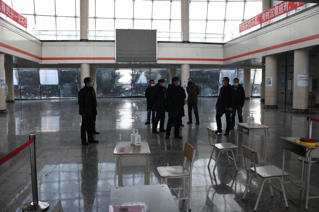 孟上九一行实地查看了考生入场核验检查卡口、常规考场和备用隔离考场布置、疫情防控和考试安全等工作情况,认真听取了关于考场安排、考试流程、应急情况处置等工作的介绍,并提出具体要求:一要科学做好疫情防控工作,多措并举、精准施策,确保考试安全、顺利进行。二要严格做好考务准备工作,切实做好监考和考务人员的培训,保证有关要求传达到位、执行到位。三要细化服务保障,关爱考生、温情服务,确保圆满完成此次招生考试的各项任务。