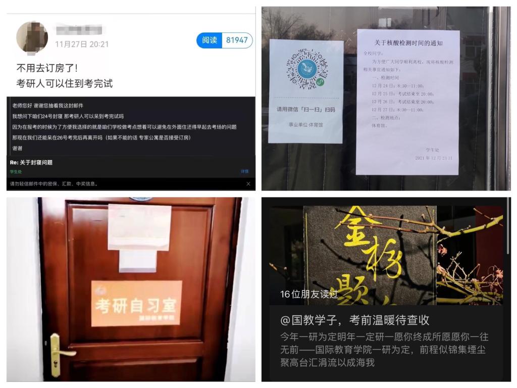 创造便利条件,解考研学生之“忧”。为减轻疫情的反复出现对考研学生带来的困扰,学校通过设立考研自习室、提供延时供电、开展考研免费辅导等方式为考研学生创造良好的学习环境。考期临近,各学院精心为考研学生做好服务保障,通过多种途径暖心慰问,送上考研“礼包”和祝福。学校为考研学生设立核酸检查绿色通道,提供免费送考送站服务,助力考研学生顺利离校。