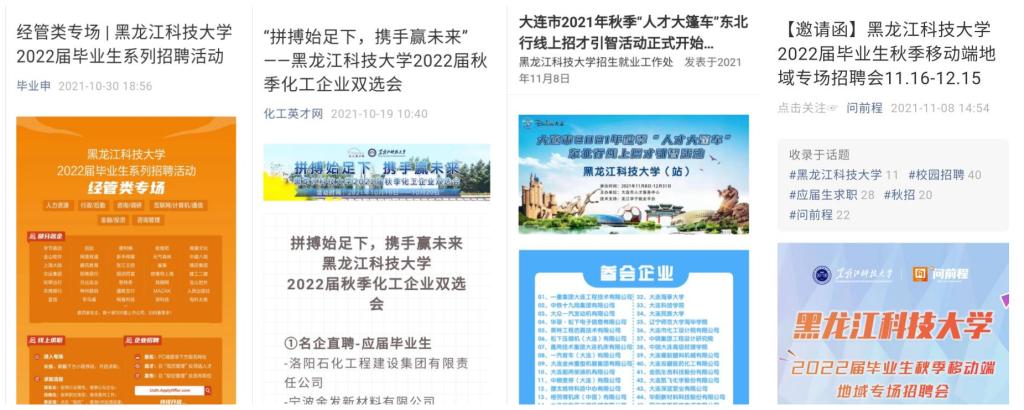 三是精准对接供岗位。开展“2022届高校毕业生就业促进月”活动,将校企精准对接作为当前就业工作重点。招就处部门领导和教师主动联系【官网】校企合作单位108家,搜集整理针对【官网】的招聘信息,发布岗位1020个,需求人数6827人。各学院按照岗位需求信息,“点对点”组织有意愿毕业生投递简历,招就处汇总统一发给用人单位。截止目前,累计投递简历552份。发动校友力量推动毕业生就业,如大连校友会发布“致学弟学妹一封信”,并组建“2022届黑OD在线大连校友会就业咨询群”,为毕业生提供就业岗位,解答求职疑惑。