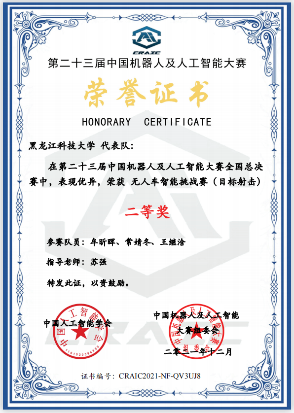 本届大赛由创新创业中心组织备赛,创新创业中心一直致力于大学生创新能力的培养,为培养学生创新、协作能力搭建平台,坚持“以赛促教、赛教结合”,促进学生主动学习和个性发展,提升学生的自主学习能力和创新能力。在备赛期间,学校教务处和机械工程学院给予参赛队伍全面的支持,在今年8月经过黑龙江省赛选拔后,成功晋级全国总决赛。在总决赛中,参赛队员对参赛作品不断改进、完善,对赛事做了充分的准备。经过不懈努力,全体参赛成员不负众望,最终在全国总决赛人工智能创新赛项中取得了优异成绩。
