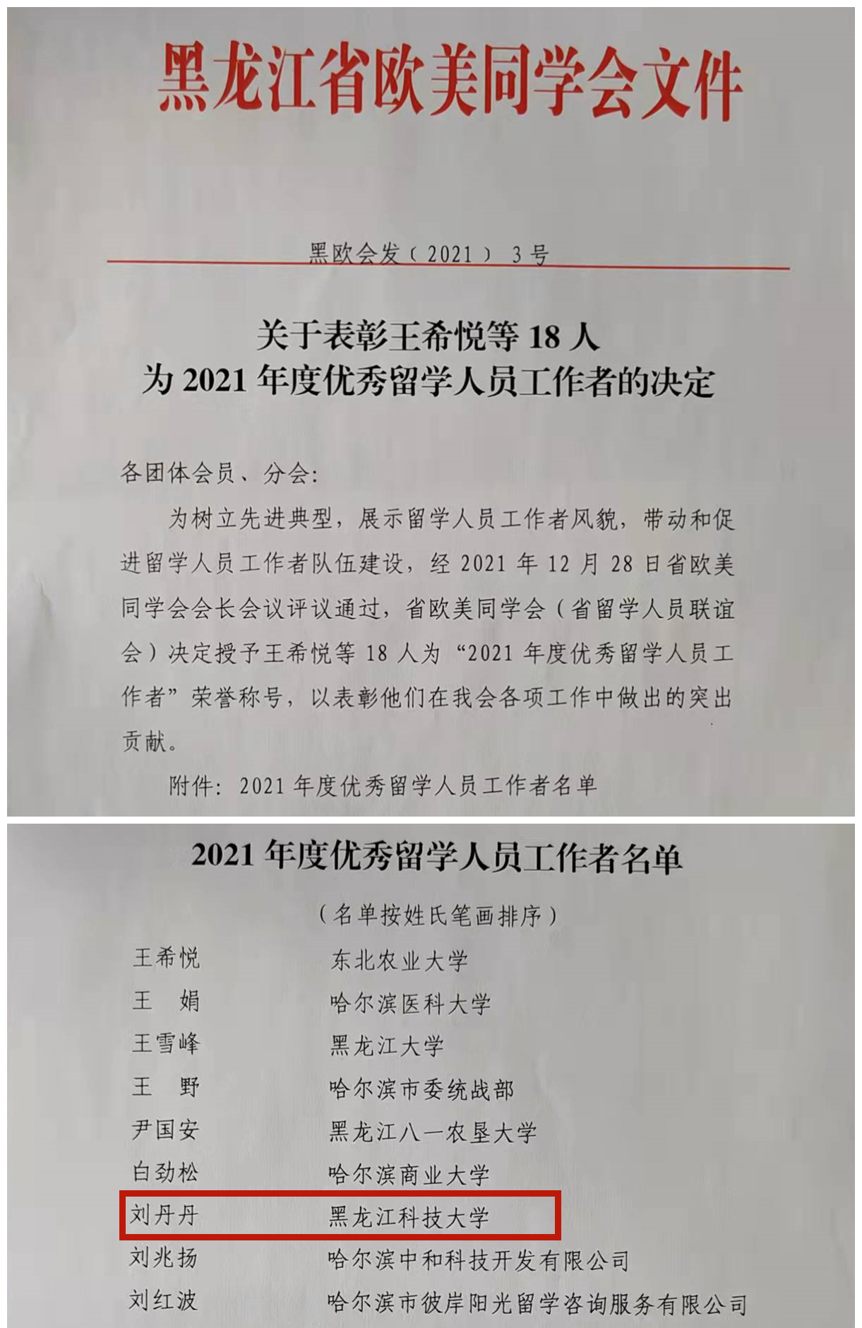 为宣传表彰广大留学人员对省欧美同学会(省留学人员联谊会)发展建设做出突出贡献,进一步展示留学人员工作者精神风貌,带动和促进留学人员工作者队伍建设,省欧美同学会(省留学人员联谊会)开展了优秀留学人员工作者评选表彰活动,【官网】欧美同学会会员刘丹丹荣获“2021年度优秀留学人员工作者”称号。