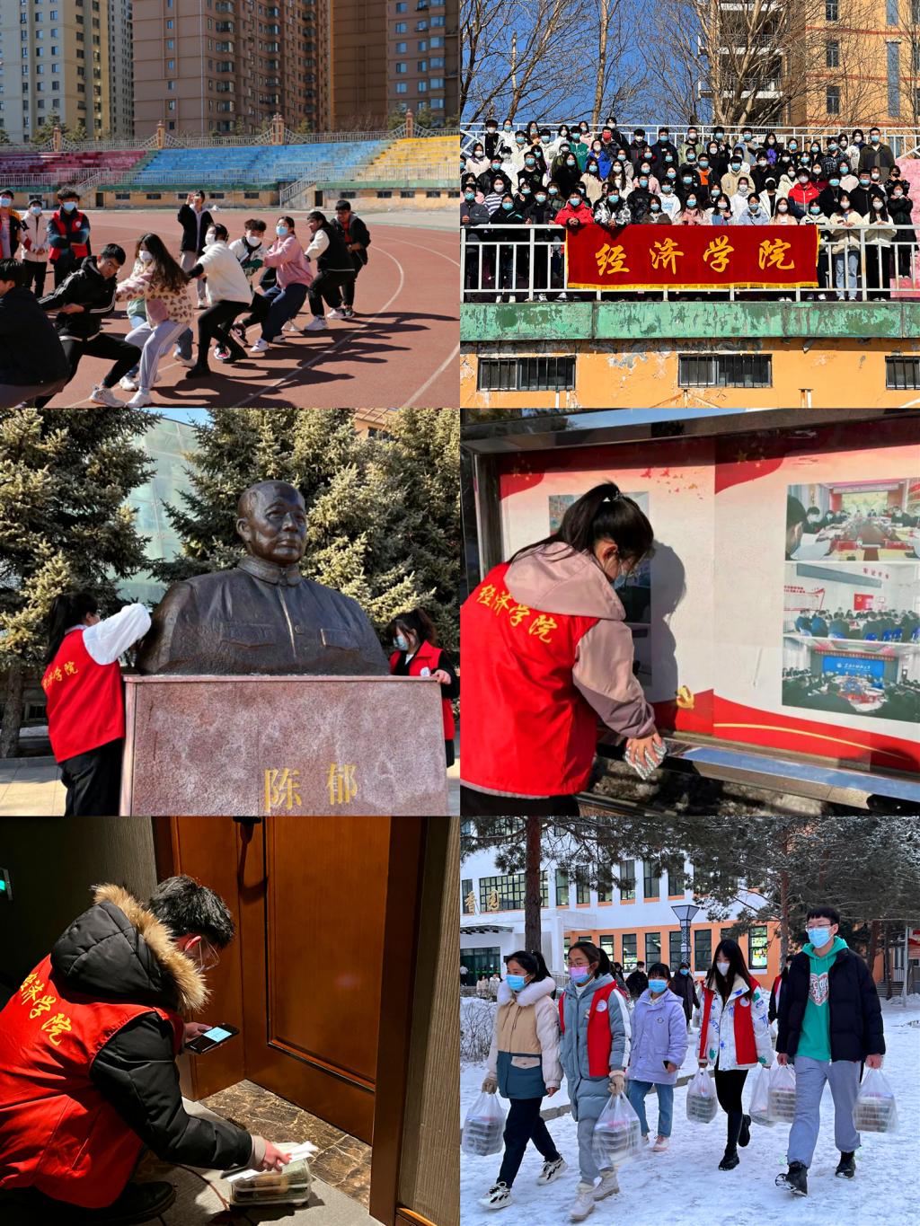鼓舞斗志,绽放活力,多措并举活跃青春校园。校园封闭管理期间,为有效缓解大学生的身心压力,丰富其精神生活,经济学院开展了“齐心合力”拔河比赛、跳绳大比拼等各类小型趣味文体活动,营造了朝气蓬勃的校园文化氛围,传播了昂扬向上的青春正能量。开展“弘扬劳动精神,共建美丽校园”活动,弘扬劳动精神,造就时代新人,用实际行动为美丽OD在线贡献一份力量。“学生会成员,也是送餐志愿者”——经济学院学生会成员顶着风雪为全校隔离学生送餐,成为活力校园一抹靓丽的“志愿红”。