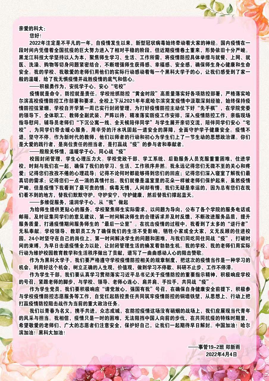 我们以青春为名义,携手共进,众志成城,在防控疫情这场没有硝烟的战场上,我们应展现当代青年的风采与担当。我相信,疫情只是一时的困难,无法阻挡中国人向前的步伐,在共同抗疫的特殊时期里,希望敬爱的老师们、广大的志愿者们注意安全,保护好自己,让我们一起期待早日解封。中国加油!哈尔滨加油!黑OD在线加油!
