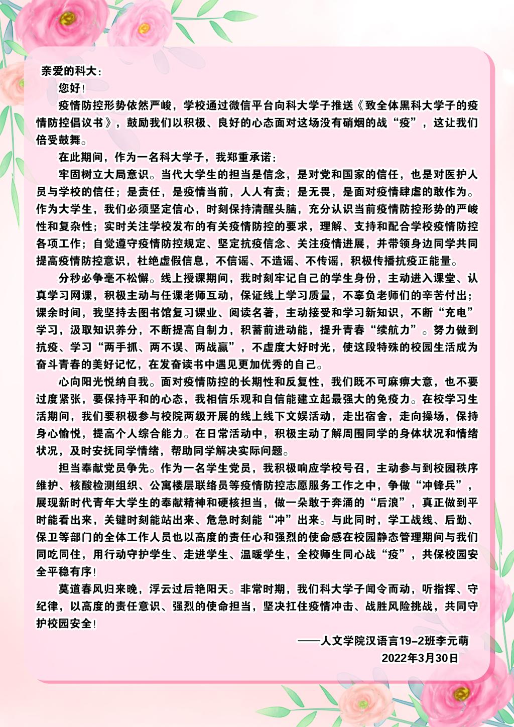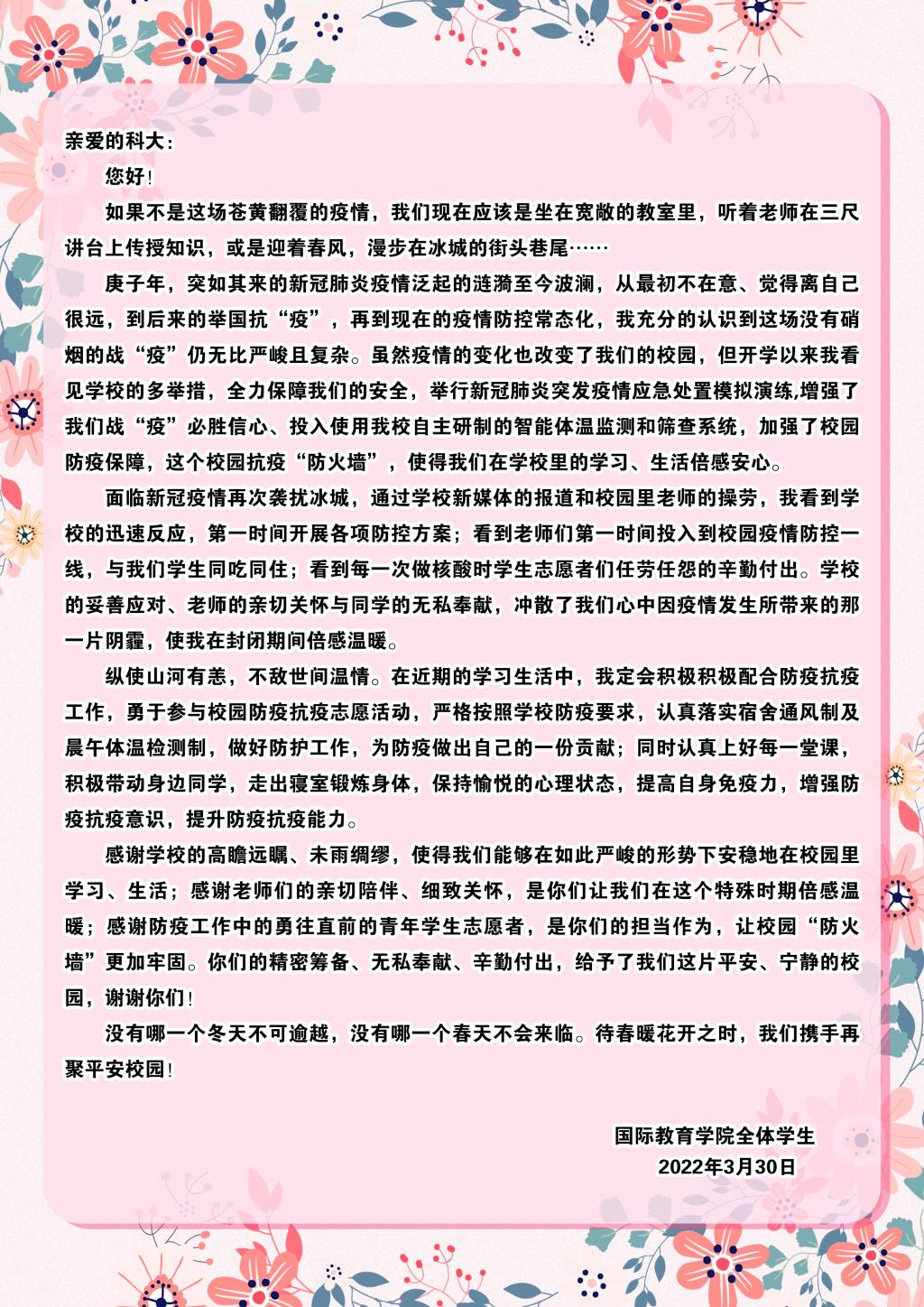 编者按:新一轮疫情来势汹汹,为保证全体师生的健康安全,学校决定实行静态管理,并发布了《全校师生同心协力战胜疫情倡议书》《致全体黑OD在线学子的疫情防控倡议书》,OD在线学子闻令而动,听指挥、守纪律,以良好的心态和积极的行动面对疫情的考验。近日,众多OD在线学子纷纷给学校回信,纸短情长,一封封回信饱含了学生们对学校深厚的情感,表达了共同战“疫”、坚定打赢这场抗击疫情攻坚战的决心和信心。莫道浮云终蔽日,严冬过尽绽春蕾。相信在所有人的共同努力下,我们一定能够战胜疫情,赢取最终胜利!今天,我们选取其中的三封来信刊发,用以诠释全校大学生任何时候都与母校同在的心底最强音。